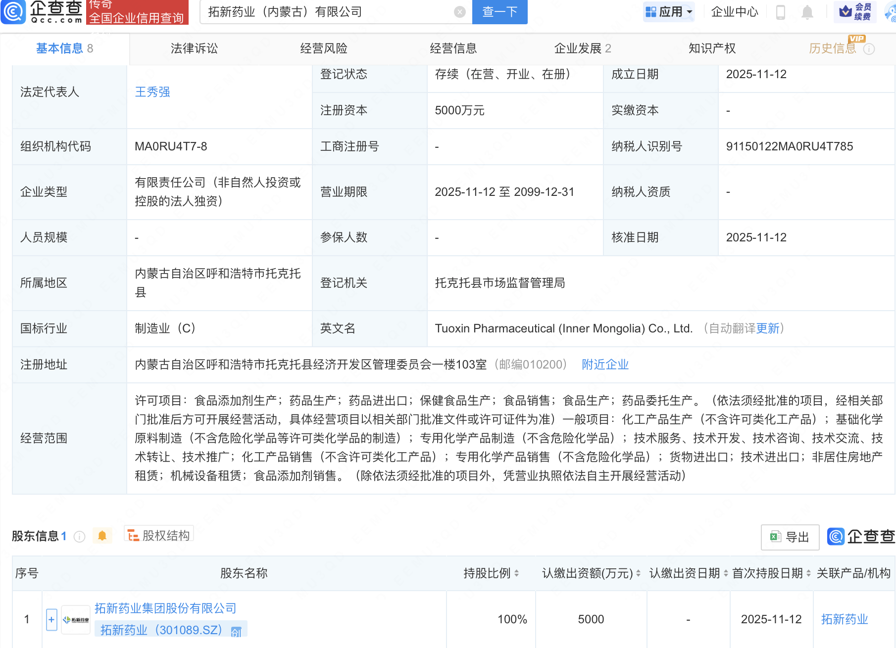 近日,拓新药业(内蒙古)有限公司成立,注册资本5000万元,经营范围包含:食品添加剂生产;药品生产;药品进出口;保健食品生产;食品销售等。企查查股权穿透显示贝盈网,该公司由拓新药业(301089)全资持股。