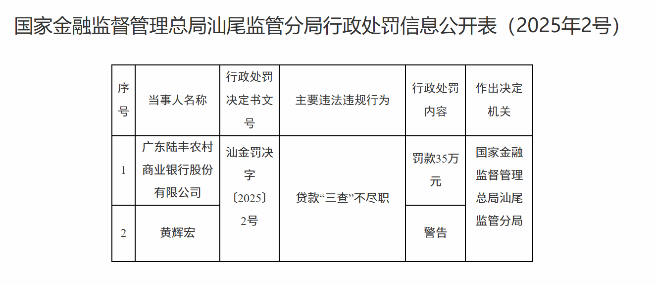 11月13日华利配资,国家金融监督管理总局汕尾监管分局行政处罚信息公开表显示,广东陆丰农村商业银行股份有限公司因贷款“三查”不尽职被罚款35万元,责任人黄某宏被警告。