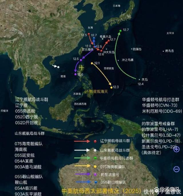 与此同时,12月5号通过宫古海峡返回东海的055鞍山舰编队,也没有返回基地休整,12月7号的卫星图像显示,鞍山舰当天在奄美大岛以西约350公里的东海海域活动,与辽宁舰形成东西夹击之势。